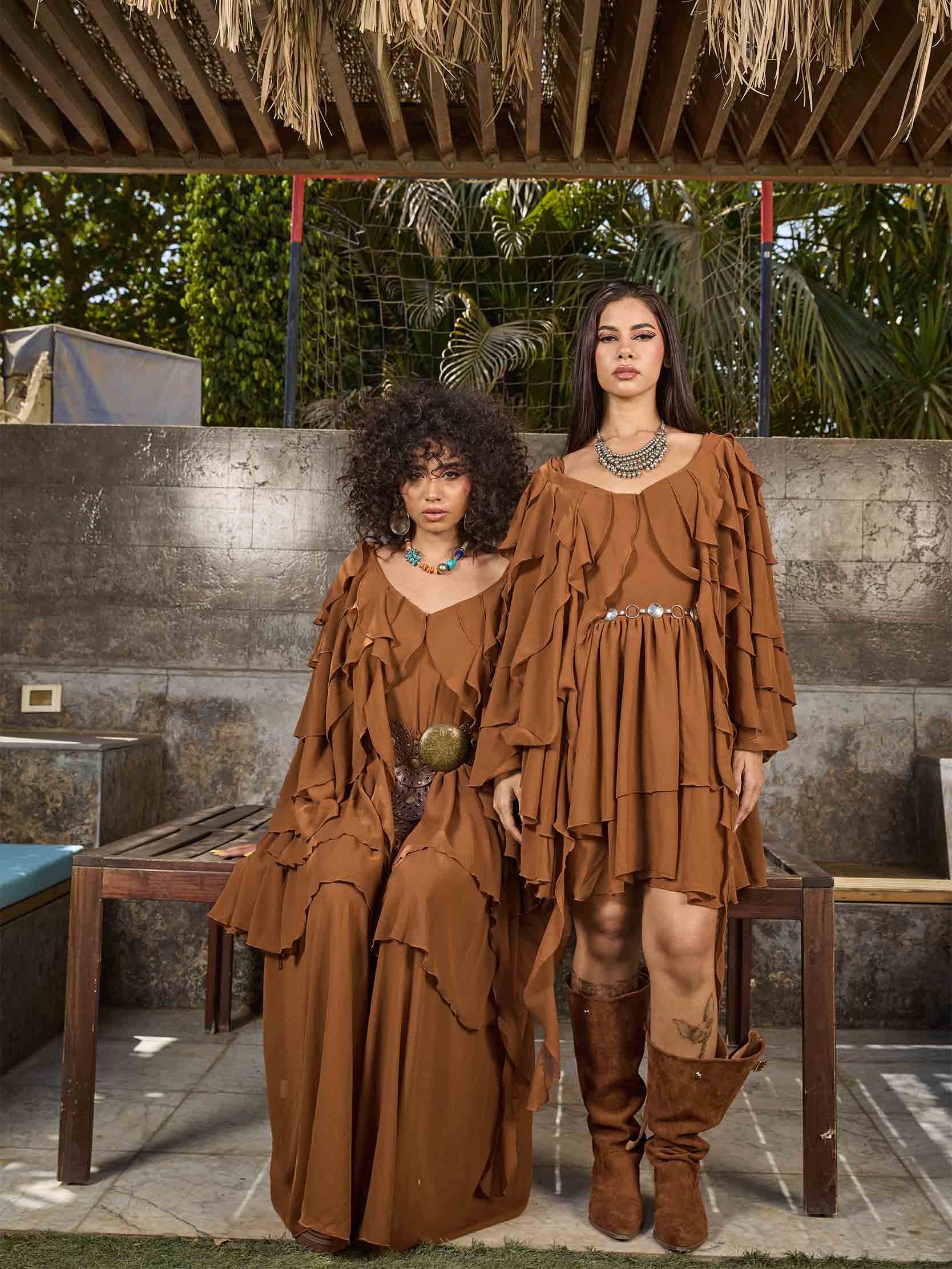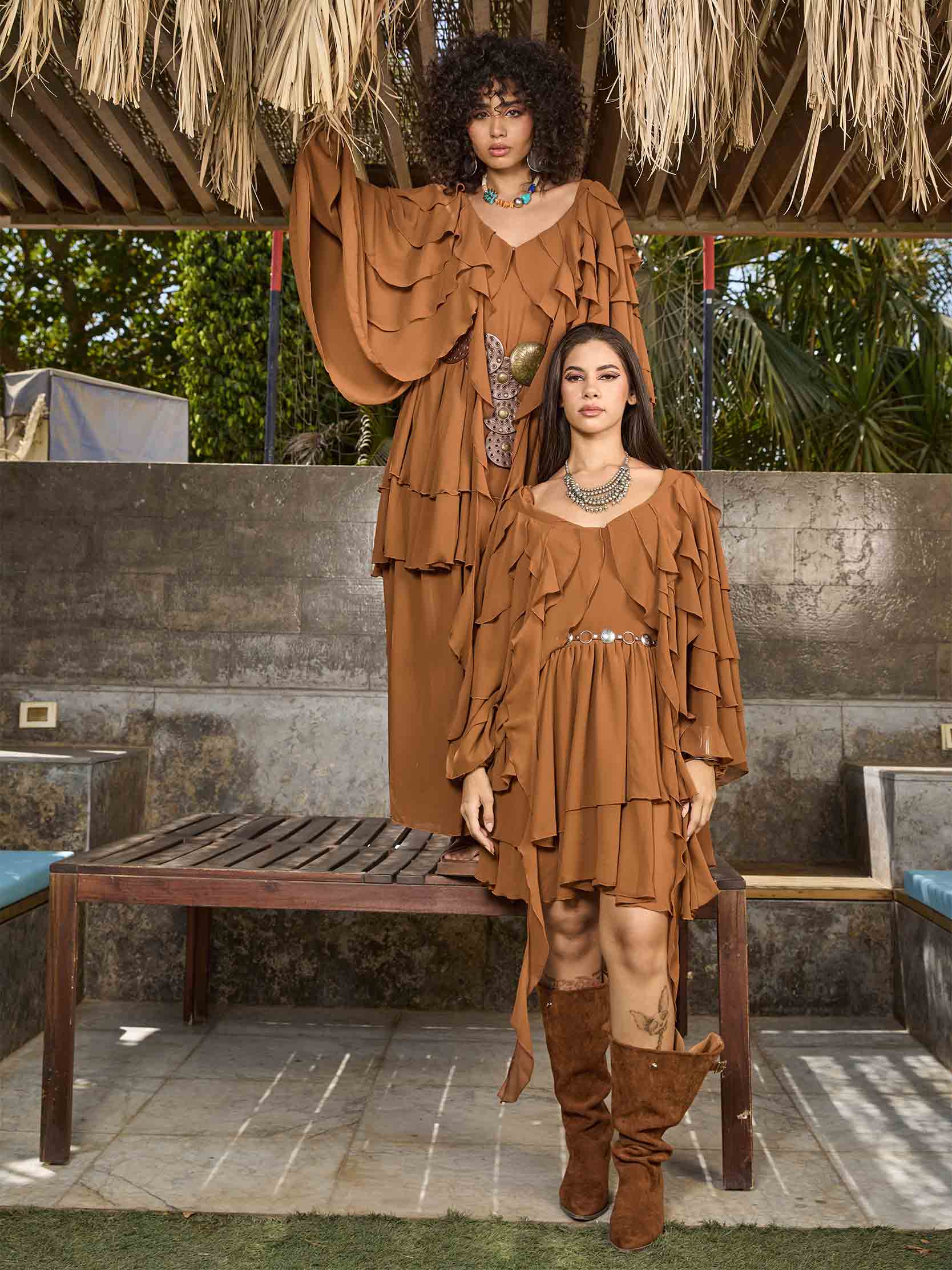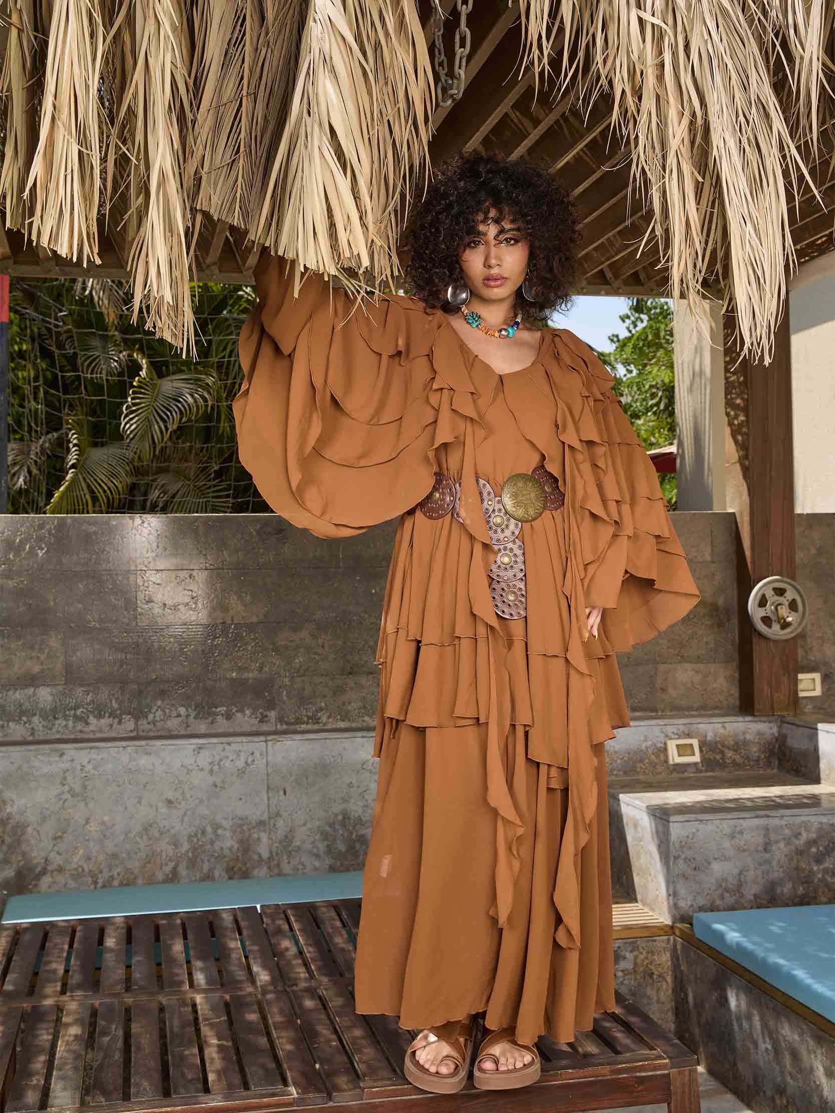 Diverso Collection - boho layered ruffled dress long , S , mocha , Style D2505BL