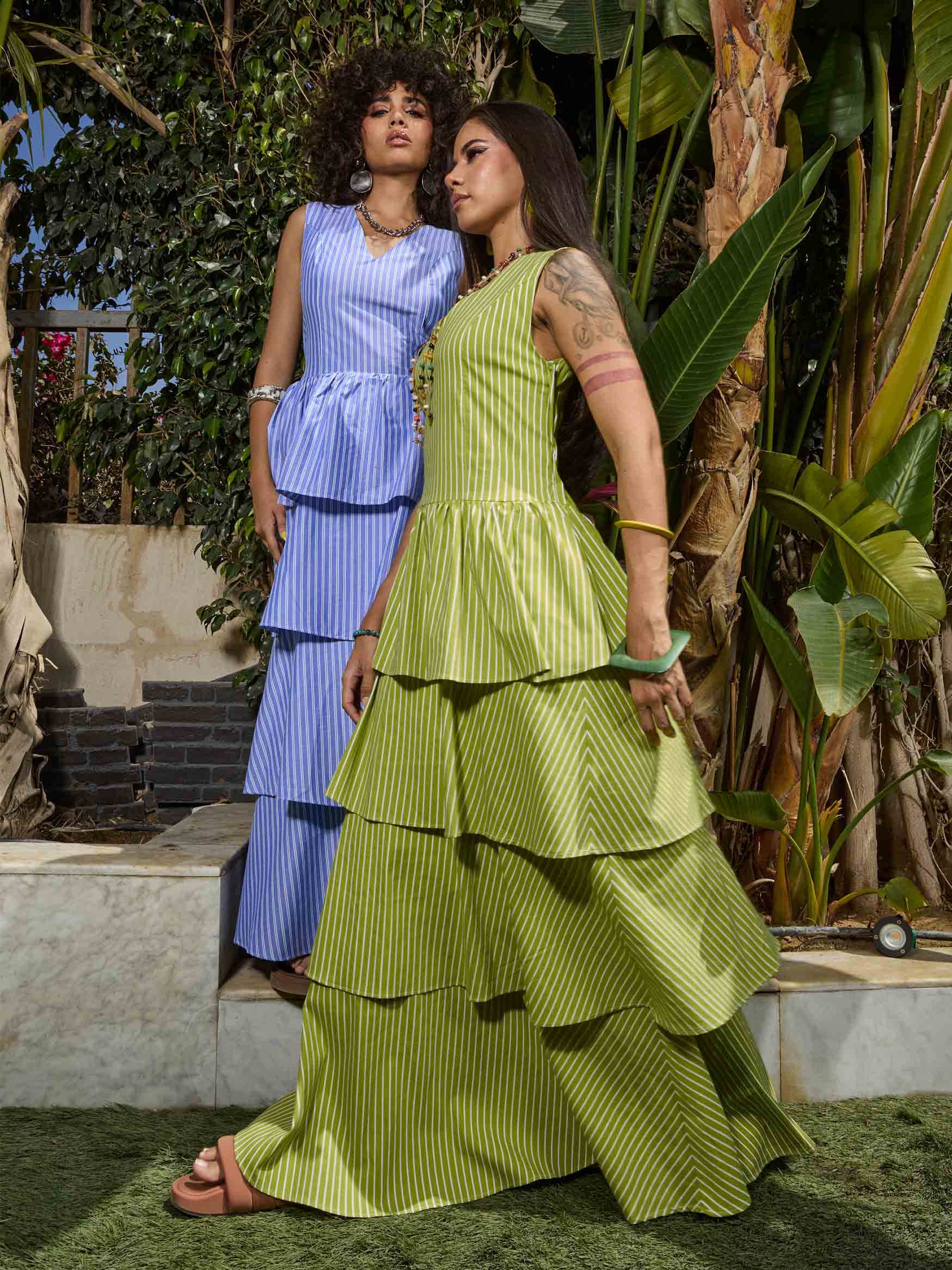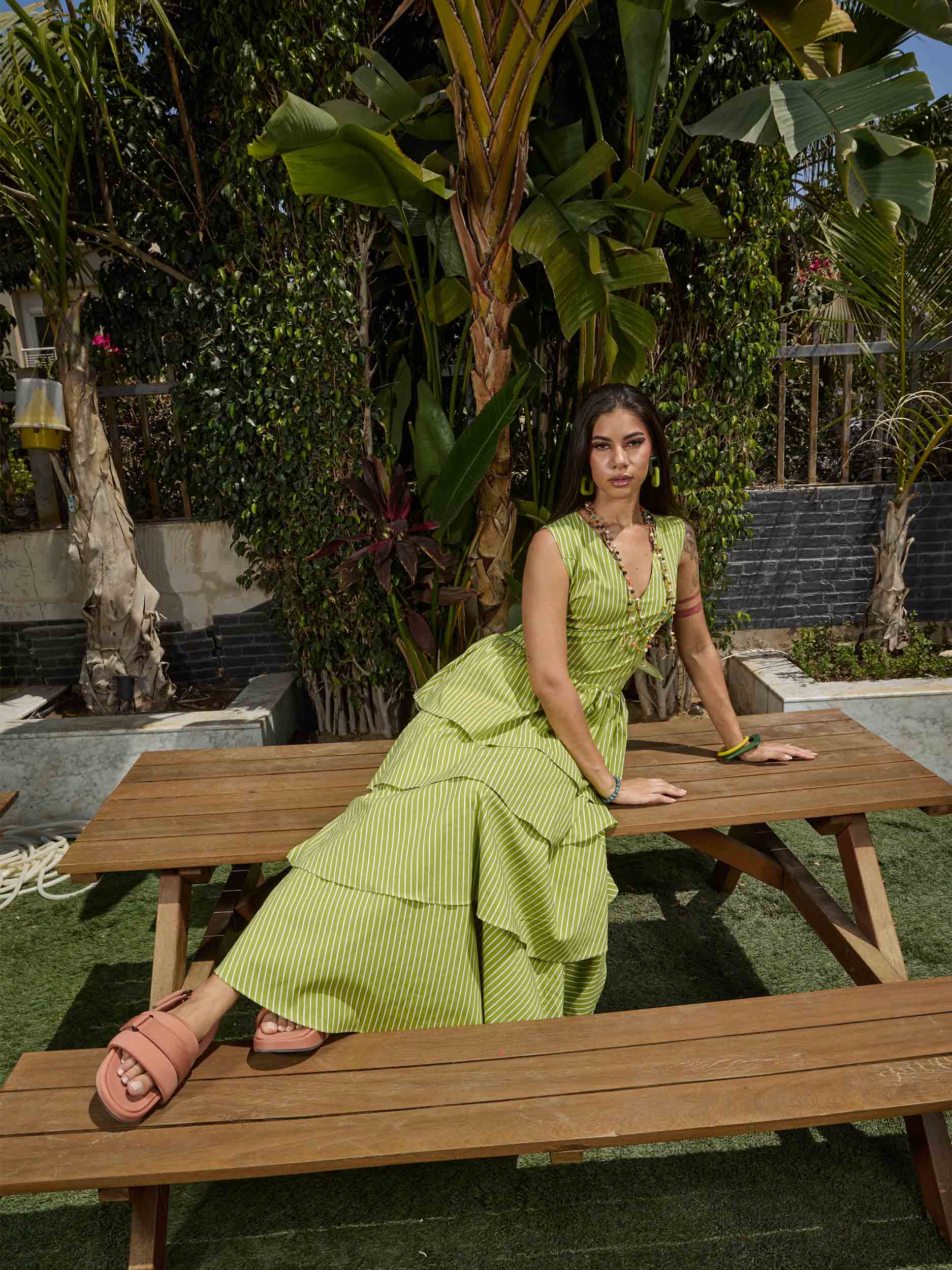 Diverso Collection - layered stripped dress , S , Green , Style D2511A