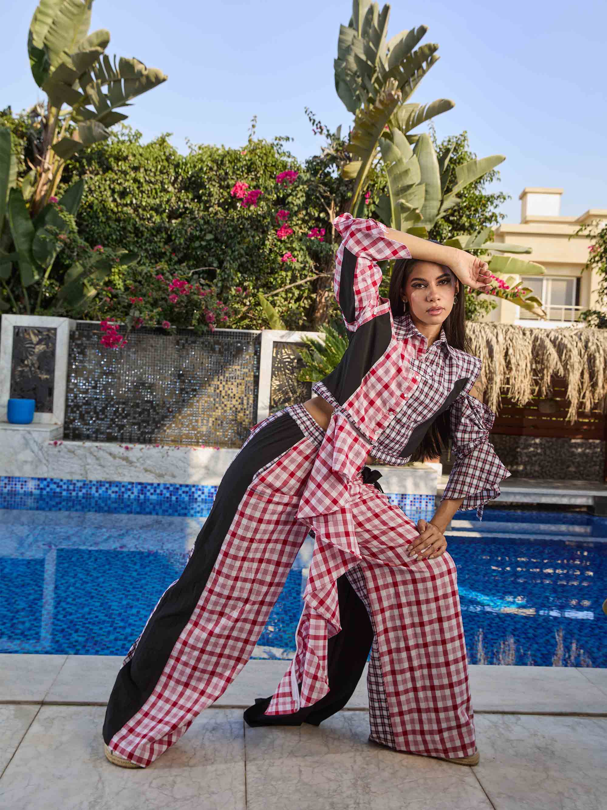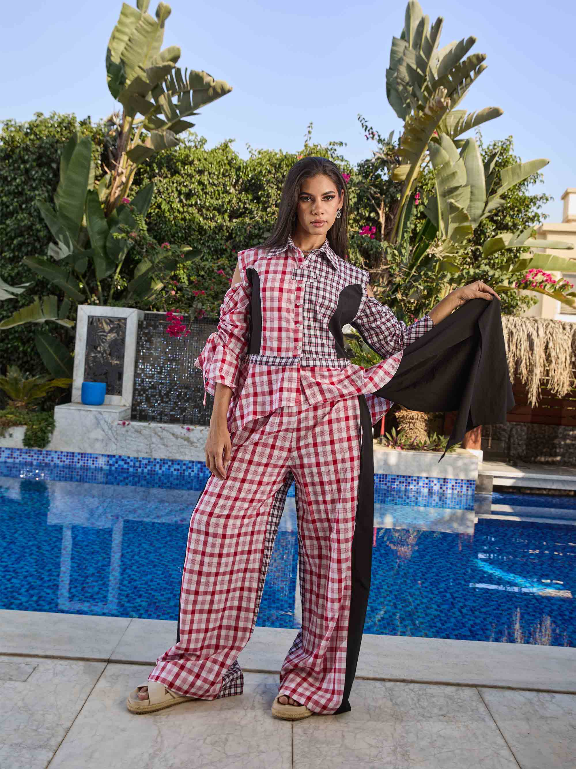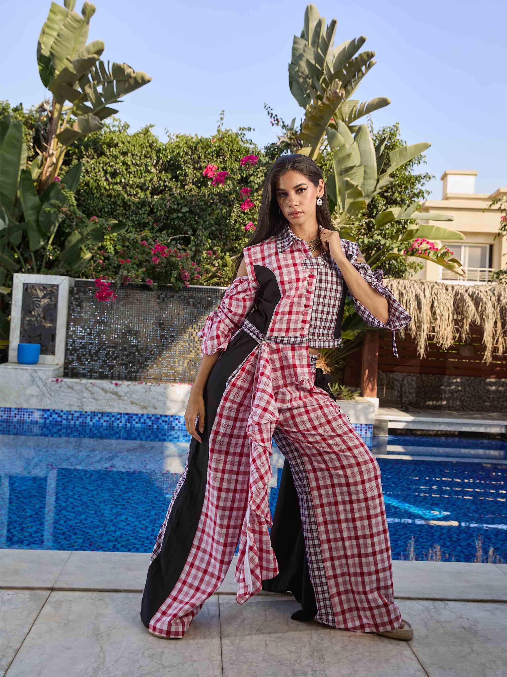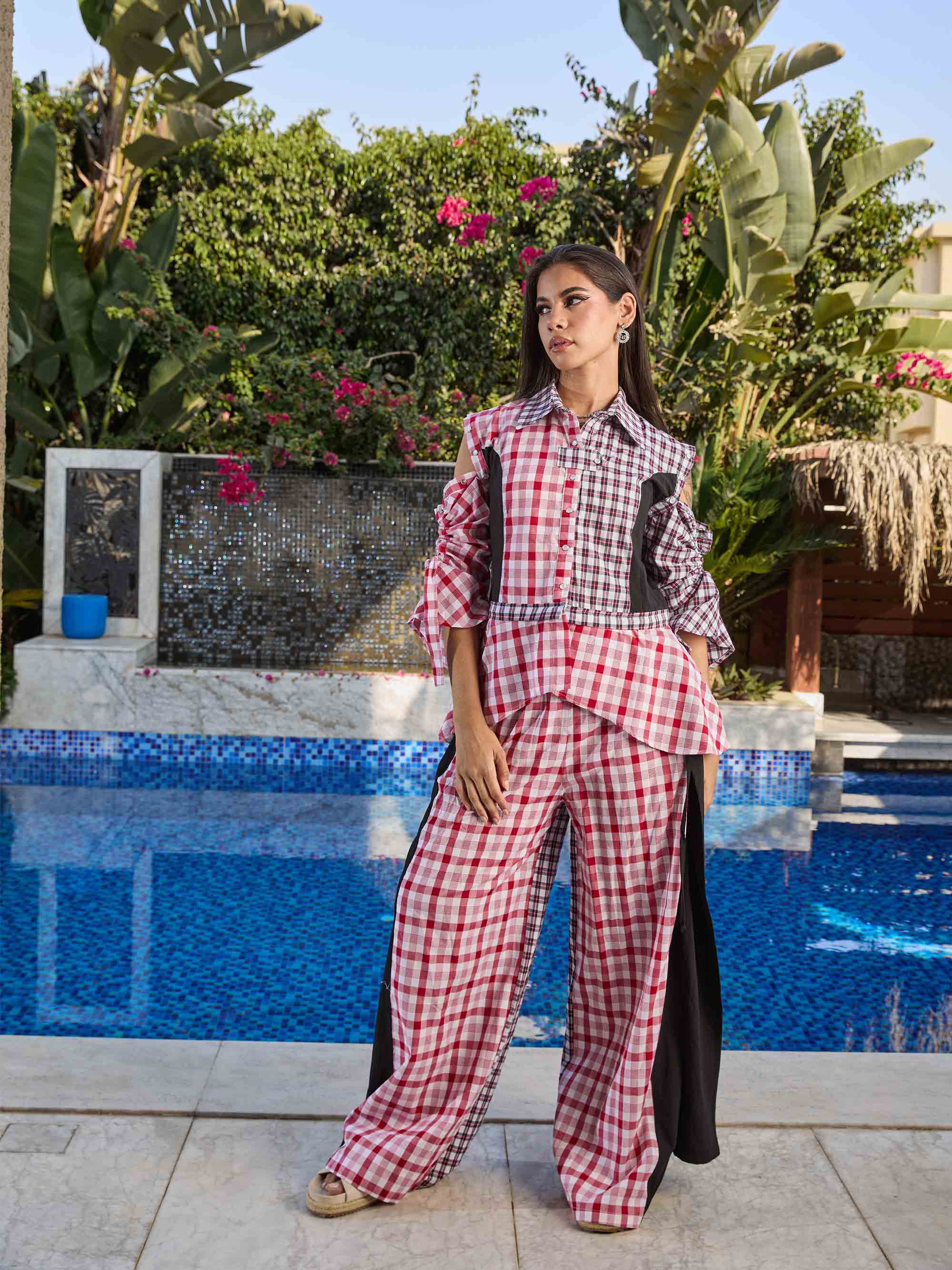 Diverso Collection - Checked Blouse With Removable Sleeves And Ruffle