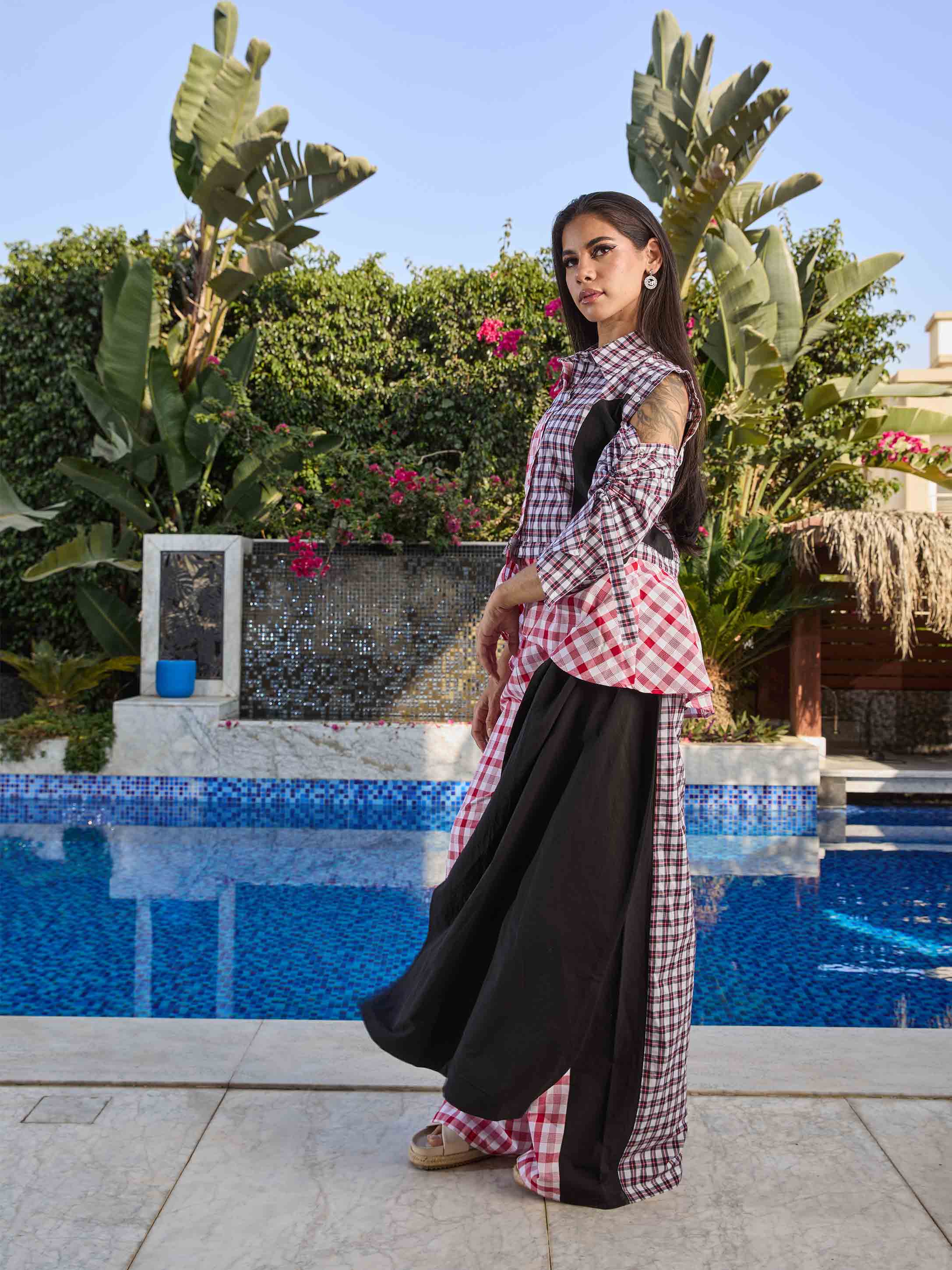 • Diverso Collection - Checked Blouse With Removable Sleeves And Ruffle