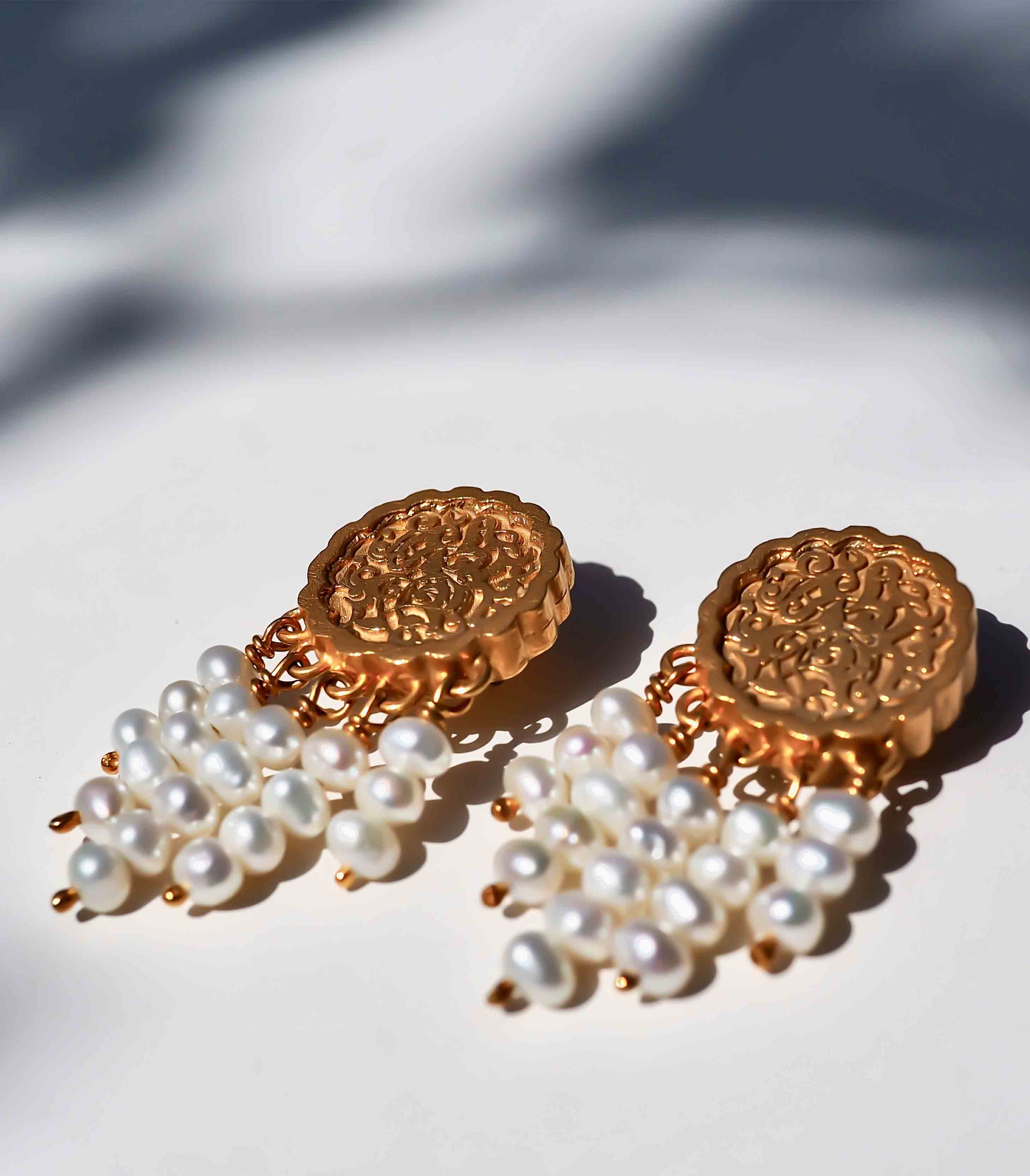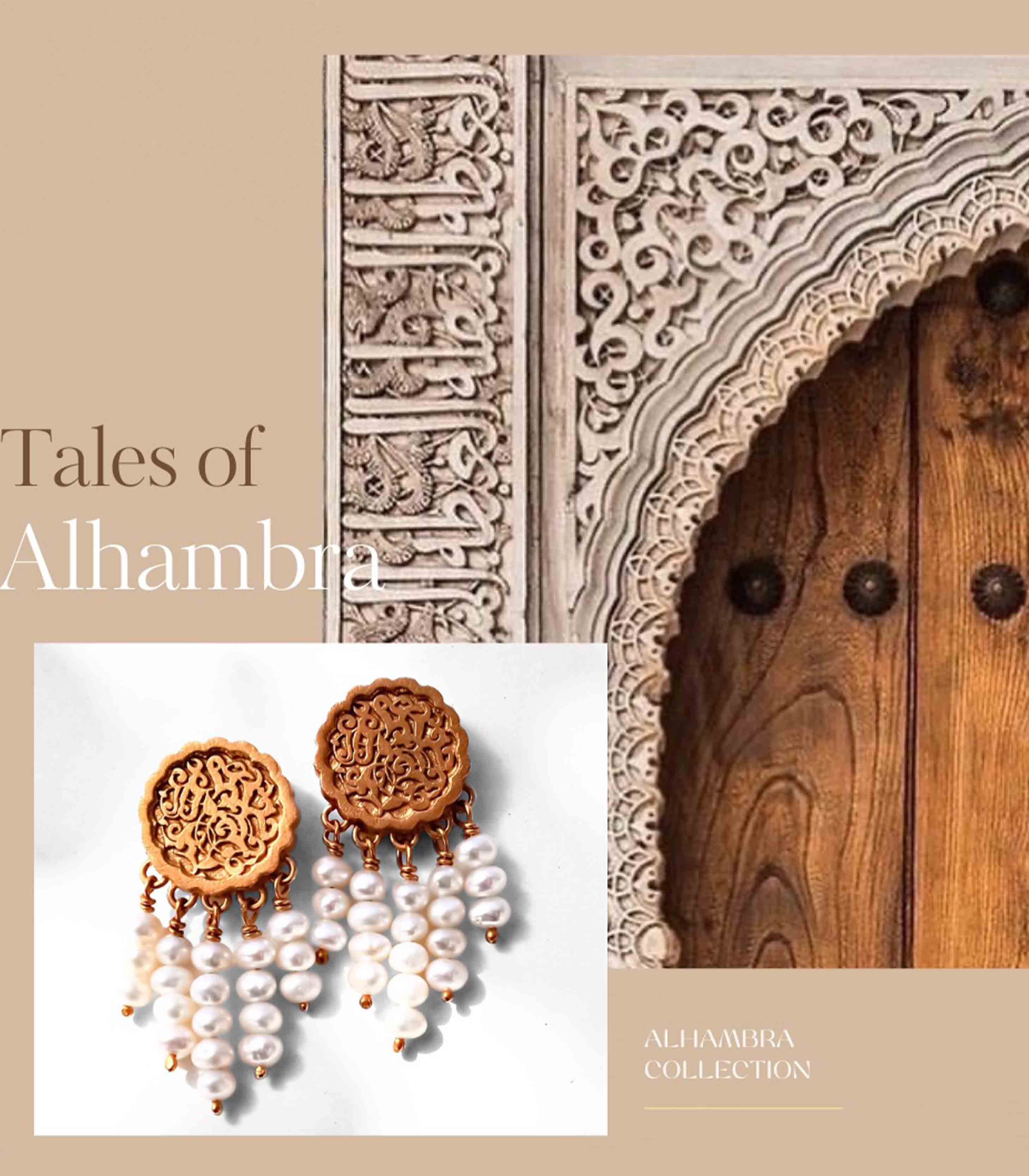 This piece is inspired by the intricately carved motifs found on the walls of Alhambra Palace, Andalusia, Spain. Depicted through the different combinations of lines and curves, the patterns reflect the underlying elements of nature, expressing the notion of continuity, unity and the Infinite. Tales of Alhambra is an earring from heritage, inspired by the sacred patterns of Alhambra, meticulously crafted and adorned with magnificent white pearls.